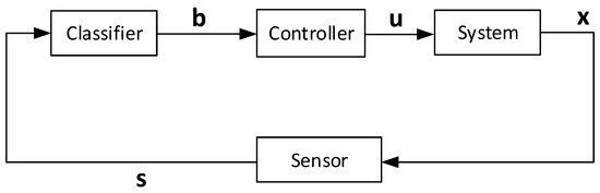 The dataset consists of the features and the labels (), where j represents index of an example in the dataset. The classifier tries to find the relationship between the features and the labels. The feature vector s depends on the state x, so we can say that the classifier indirectly learns the mapping from state to the control. This way, the classifier generates the control input u to the system and it results in a closed-loop feedback system, as shown in Figure 6.