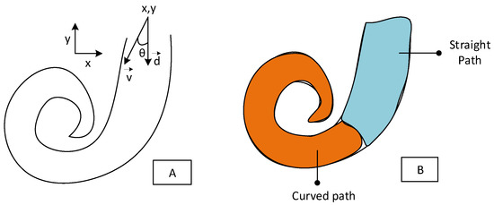 The insertion of the electrode array is configured such that it is presented as () in the plane where () points are considered as the location of array tip, and angle represents heading of the array with respect to centre line of the ST model towards either of the modular/lateral walls (as depicted in Figure 7A). Let be the centre line trajectory of the electrode array and be defined as direction of array insertion away from the centre line direction. The goal of the insertion is to keep the electrode array in the centre of the straight path of the ST model until it touches the curved path, where it slides along the curved path. The motivation of keeping the electrode array on the centre line trajectory is twofold: (1) it would not damage the delicate structure of the ST walls; (2) the centre line insertion imposes less overall force when the array touches the curved path and slides along it.