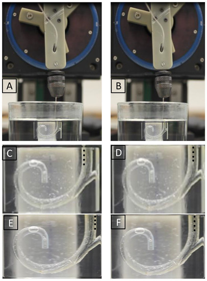 Figure 9 presents the pictorial representation of one of the real-time experiments. In Figure 9A, the experimental setup is shown as the EA is inserted for 4 mm and data are collected, EA trajectory is towards the medial wall as EA can be seen inside the saline-filled ST model. A close-up of this trajectory is shown in (C). Once the recorded data vector is passed on to classifier A and classifier B, the controller makes the correction by moving the rotational stage of the actuator towards the right by , as shown in Figure 9B and in the close-up in (D). The trajectory could be towards the lateral wall, as shown in (E), and is corrected, as shown in (F).