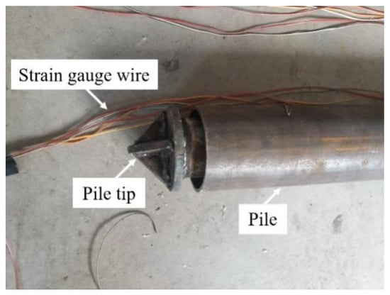 In order to obtain the strain at different depths of the pile section under load, the steel pipe was divided into four 0.8 m sections of steel pipe and one 1.4 m section of steel pipe. After the strain gauge was attached to the inner side of the test pile, the steel pipe was welded. The strain gauges were BFH-120-3AA metal strain gauges, the size of the sensitive grid was 3 × 2 mm (length × width), the nominal resistance was 120 Ω, the sensitivity coefficient was 2.08 ± 1%, and the accuracy grade was A. Epoxy glue and silica gel were used on the surface of the strain gauge to prevent the strain gauge from becoming damp when exposed to water in the ground. The strain gauge arrangement is shown in Figure 1. The data acquisition of pile strain gauges was connected and collected by the DH3820 high-speed static strain data acquisition instrument. This high-speed static strain data acquisition instrument had a sampling frequency of 100 Hz, which can accurately acquire and record the slow change signal in the test to ensure the accuracy of the test acquisition data.