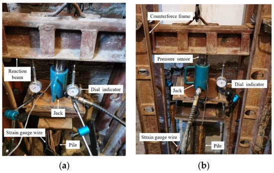 The pile tip of the pile-end soilless compressive pile was separated from the pile body, as shown in Figure 2. After the pile-end soilless compressive pile was pressed to the design position, it was then pulled up by 50 mm, and the pile tip was separated from the pile body to form a pile-end soilless compressive pile. The static load test was carried out after 28 d of pile construction, and the test was carried out by the slow maintenance load method [22]. Load–displacement curves and displacement–time logarithm curves were obtained. The site was loaded, as shown in Figure 3. Simultaneous recordings of the strain gauge readings were carried out during loading.