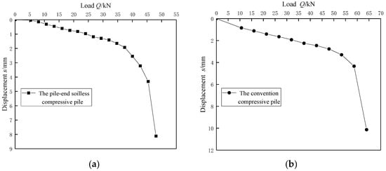 According to the test results, the load–displacement curves (Q-s curve) of the pile-end soilless compressive pile and the conventional compressive pile are plotted as shown in Figure 4.