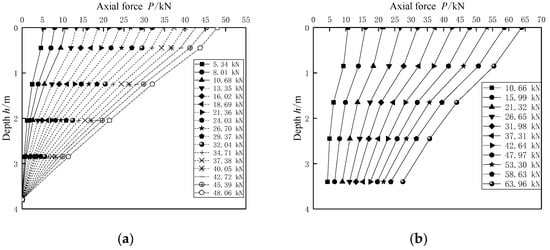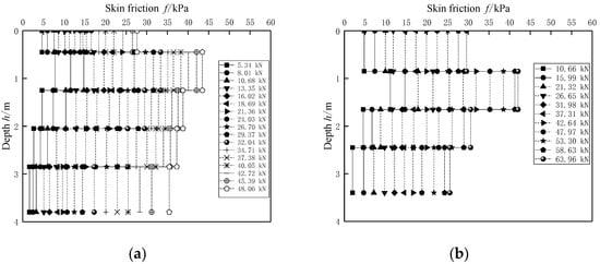Under the vertical load, the axial elastic compression of the pile causes the relative displacement of the pile and soil, thereby generating the skin friction, while the vertical load overcomes the skin friction and transmits down the pile body. As shown in Figure 5, the axial force curve of the pile body is roughly linearly distributed. The steepness of different segments reflects the size of the skin friction of the segment; the steeper the curve, the smaller the skin friction, and vice versa, the greater the skin friction. At the initial stage of loading, the slope change of the axial force curve on the upper part of both test piles is relatively obvious, which indicates that the skin friction at the pile body is fully exerted. At the same depth, as the load increases, the slope of the axial force distribution curve gradually decreases until it is stable. This shows that the skin friction develops gradually with the increase of the load and finally tends to be stable. This is mainly because when the load is gradually increased, the compression and displacement of the pile body increase and the skin friction increases with the increase of the relative displacement until it reaches stability.