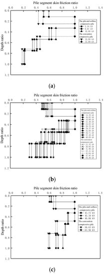 Distribution curve of the pile segment skin friction ratio along depth: (a) the linear stage, (b) the local shear stage, and (c) the failure stage.