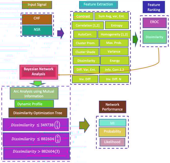 The Schematic flow of our model is reflected in Figure 1. We computed the GLCM texture features proposed by Avinash Uppuluri publicly available at (https://www.mathworks.com/matlabcentral/fileexchange/22187-glcm-texture-features, accessed on 20 June 2022). The description of features is mentioned in the available code i.e. 1 features taken by author from MATLAB and 2 features taken by author from the paper. The Bayesian approach has recently gained popularity and is utilized in many medical, signal, and image-processing problems. Classifying congestive heart failure is a complex problem which requires lots of effort in developing automated tools. To consider the diverse dynamics, we first computed the gray-level co-occurrence matrix (GLCM) features from the CHF and NSR subjects. We then ranked these features based on ROC values. The dissimilarity feature yielded the highest entropy values, indicating highly important features. We then set the dissimilarity feature as the target variable and applied a Bayesian approach in our further deeper analysis, which was based on four different clusters states.