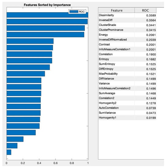 After extracting the features, all features are not equally important. The feature importance was computed using supervised feature ranking algorithms []. The feature importance ranking (FIR) algorithm was developed in MATLAB []. The importance of the computed features was measured using an empirical receiver operating characteristic (EROC) curve and a random classifier slope. The greater the ROC value indicate the more important feature.