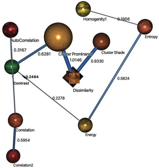 In this study, we computed the GLCM features and computed the associations among them using mutual information, as reflected in Figure 3. The arcs show the strengths of relation, and the nodes show the normalized mean values. The relationship of the highest strength was yielded by followed by , , and so on.