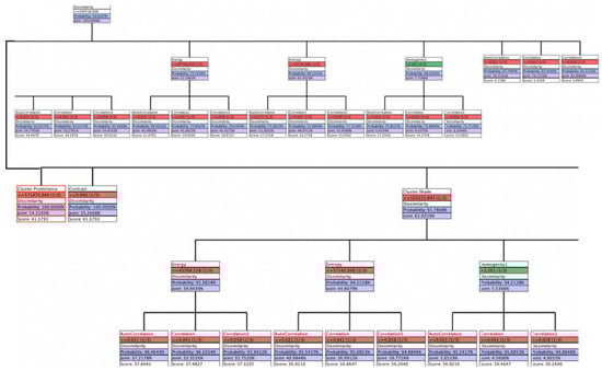 At the second level, cluster shades produce child nodes with probabilities such as energy (95.38%), entropy (94.21%), homogenity1 (94.21%), autocorrelation (93.56%), correlation (92.91%), and correlation1 (92.64%). Likewise, energy has child nodes of autocorrelation, correlation, and correlation2. Moreover, homogeneity1 has child nodes of autocorrelation, correlation, and correlation2. At the third level, energy, entropy, and homogenity1 have the child nodes autocorrelation, correlation, and correlation2.