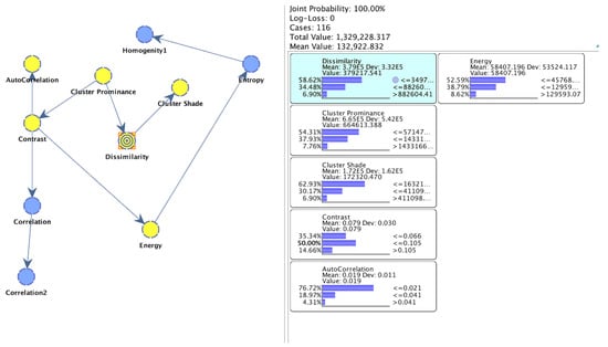 Figure 6 shows the significance of the selected top ranked dissimilarity node with other nodes such as cluster prominence, cluster shade, contrast, autocorrelation, energy, entropy, correlation, correlation2, and homogeinity1. The highest association was yielded in the cluster ≤349,738 (58.62%) with the red lines showing cluster prominence, contrast, and cluster shade with probability in the range of 0.0 to 1.0, and with other nodes in the range 0.3 to 0.75. The second highest occurrence of dissimilarity was yielded in the cluster ≤882,604 (34.48%), indicated in the green color, with cluster prominence and cluster shades occurring in the highest probability range of 0.0 to 0.90.
