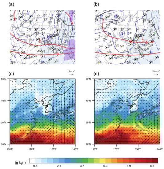 Surface weather maps at 0900 LST on (a) 17 and (b) 18 January 2017. Horizontal wind vectors and water vapor mixing ratio at 900 hPa at 0900 LST on (c) 17 and (d) 18 January 2017. The location of Seoul is indicated by the cross symbol. (a,b) L and H represent low- and high-pressure systems, respectively. Pressure trough and ridge in upper troposphere are indicated by the black straight and zigzag lines, respectively. Red lines and arrows represent jet streams in upper troposphere, and purple shaded areas represent jet streams in lower troposphere.