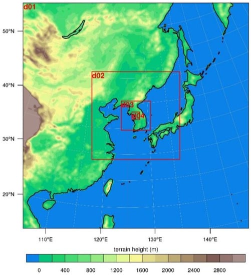 To test the performance of the PBL parameterization schemes in simulating the wintertime lower troposphere in an urban area, we used Weather Research and Forecasting (WRF) model version 4.1.3 [] in this study. We adopted four domains with two-way nesting, and the horizontal grid resolutions of the domains were 27, 9, 3, and 1 km (Figure 3). The model domain had 72 vertical layers and 43 vertical layers below ~2 km from the ground to accurately simulate the lower troposphere. The vertical grid resolution below 1.5 km was ~40 to ~50 m. We used the 6-hourly National Centers for Environmental Prediction (NCEP) final analysis data with a horizontal grid resolution of 0.25° as the initial and boundary conditions. We ran four simulations with the YSU [], Mellor–Yamada–Janjić (MYJ, ref. []), Mellor–Yamada–Nakanishi–Niino (MYNN, ref. []), and Asymmetric Convective Model version 2 (ACM2, ref. []) PBL schemes. These four PBL schemes are the most widely used PBL schemes among the WRF model users. The YSU and ACM2 schemes are non-local schemes, and the MYJ and MYNN schemes are local schemes using a turbulence kinetic energy closure. In the four simulations, we used the surface-layer schemes relevant to the PBL schemes. We used the revised fifth-generation Pennsylvania State University–National Center for Atmospheric Research Mesoscale Model (MM5) surface-layer scheme for the YSU PBL scheme, the Eta similarity surface-layer scheme for the MYJ PBL scheme, the MYNN surface-layer scheme for the MYNN PBL scheme, and the Pleim-Xu surface-layer scheme for the ACM2 PBL scheme. For other physics schemes, we used the Dudhia shortwave radiation scheme [], Rapid Radiative Transfer Model (RRTM) longwave radiation scheme [], Kain–Fritsch cumulus convection scheme [] only for the outermost two domains, and WRF single-moment 6-class cloud microphysics scheme [] in the model. Additionally, we used a single-layer urban canopy model [] to precisely reproduce urban meteorology. We integrated the model from 0300 LST on 16 January to 0300 LST on 19 January, and we used simulation data during the radiosonde observation period for the analysis.