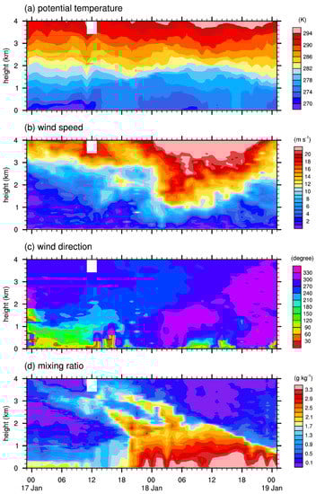 The Hovmöller diagrams of potential temperature, wind speed, wind direction, and water vapor mixing ratio from the radiosonde observation are shown in Figure 4 to illustrate temporal changes in the overall characteristics of the lower troposphere. From ~1900 LST on 17 January, the water vapor mixing ratio below 2 km from the ground abruptly increased and the dominant wind direction near the surface tended to change to westerly or northwesterly. These changes in water vapor mixing ratio and wind direction showed that the moisture advection by the westerly or northwesterly winds, illustrated in the synoptic weather patterns in Figure 1b,d, began to affect Seoul at ~1900 LST on 17 January. Because the moisture advection also caused cloudy weather in Seoul, the magnitude of the diurnal variation of the near-surface air temperature on 18 January was smaller than that on 17 January. From 0000 LST on 18 January, wind speed above a height of 1.2 km considerably increased. The strengthened air flow in the upper troposphere was related to the increase in wind speed above a height of 1.2 km.