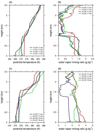 Vertical profiles of the (a,c) potential temperature and (b,d) water vapor mixing ratio at (a,b) 1000, 1200, 1300, and 1500 LST on 17 January 2017, and (c,d) 1600 and 2000 LST on 17 January 2017 and 0000 and 0400 LST on 18 January 2017.