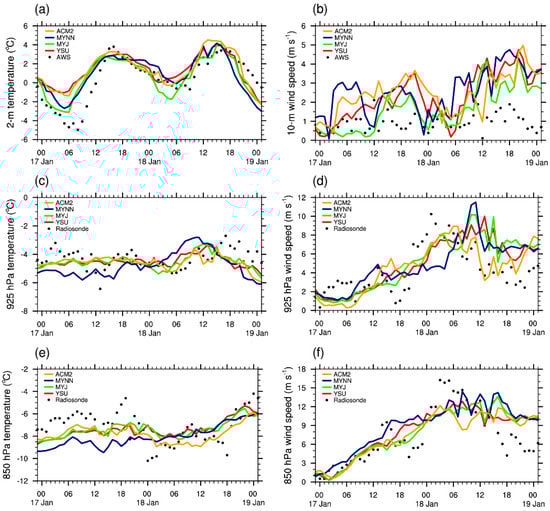 We validated the simulations with the YSU, MYJ, MYNN, and ACM2 PBL schemes using the radiosonde observation data and the ground meteorological data from Gangnam AWS (Figure 2). We show the simulated and observed 2-m air temperature and 10-m wind speed at the location of Gangnam AWS (Figure 6a,b). We also show the air temperatures and wind speeds from the numerical simulations and radiosonde observation at 925 and 850 hPa (Figure 6c–f). The WRF model overestimated the daily minimum air temperature on 17 January, but the diurnal variation of the observed 2-m air temperature was well-reproduced in all four simulations in general. Especially, in the four simulations, the air temperature decrease from 0000 to 0600 LST on 18 January was small due to the weakened radiative cooling by the cloudy weather, as exhibited in the observation. After 1800 LST on 18 January, the four simulations underestimated 2-m air temperature. The haze at the night on 18 January was not well-reproduced in the four simulations, resulting in an overestimation of radiative cooling from 1800 LST 18 January. The simulated 10-m wind speed was generally larger than the observed one. The magnitude of the 10-m wind speed increase from 1000 LST on 18 January was larger in the four simulations than in the observations. The wind speed decrease in urban areas due to buildings was not well-represented in the numerical simulations, similar to other numerical simulations [,,]. At 925 and 850 hPa, the general tendencies of the simulated air temperatures in the four simulations reproduced those in the radiosonde observation. However, small-scale perturbations in the air temperature observation were not captured by the simulations in general. The general tendencies of the simulated 925 and 850 hPa wind speeds in the four simulations were similar to the observations, except for the wind speed increase from 0000 to 0600 LST on 18 January. The air flow in the upper troposphere related to the wind speed increase (Figure 4b) was not accurately reproduced in the simulations.