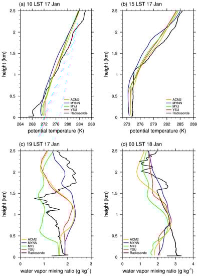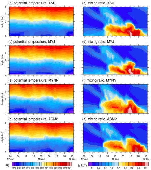 To compare the structures of the lower troposphere in the four simulations, Hovmöller diagrams of the potential temperature and water vapor mixing ratio using the simulation data at the location of the radiosonde launch site are shown in Figure 7. From 0800 to 1300 LST on 17 January, the potential temperature below ~1 km slowly increased in the four simulations compared with that in the observations. The four simulations did not reproduce the abrupt development of the layer with nearly constant potential temperature at 1300 LST. The process of the residual layer with a small vertical temperature gradient becoming a part of the CBL was not well-simulated in the four simulations. The smaller potential temperature variation below ~1 km on 18 January was well-reproduced in the four simulations, except for the large decrease in the potential temperature from ~1800 LST on 18 January. The simulation with the MYNN scheme showed the rapid increase in the potential temperature below ~1 km compared with the other simulations. Additionally, the height of the layer with a nearly constant potential temperature was the highest in the MYNN scheme (~1 km) and similar to that in the observation. Thus, we considered the MYNN scheme as the most accurate scheme in simulating the CBL development during the daytime on 17 January. This result is in line with that of another optimization study of WRF physical parameterization schemes [].