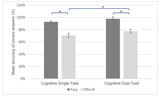 Mean accuracy and standard errors (error bars) of the percentage of the correct answers during cognitive single-task and dual-task. * p < 0.05-significant difference between difficult cognitive single-task and difficult dual-task, easy and difficult cognitive single-task, easy and difficult dual-task; not statistically significant between easy cognitive single-task and easy dual-task (Wilcoxon signed-rank test).