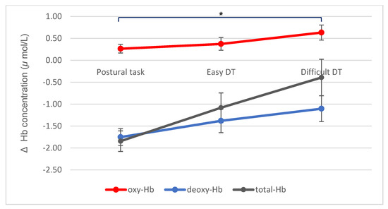 The present study demonstrated that the oxy-Hb, deoxy-Hb, and total-Hb concentrations during the difficult dual-task performance were higher than in the easy dual-task and postural task (single-task). However, only the oxy-Hb and deoxy-Hb concentrations differed significantly across the postural task and difficult dual-task. On the other hand, significant differences were found in total-Hb concentrations between the easy dual-task and postural task, and the difficult dual-task and postural task.