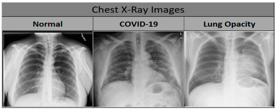 The dataset of chest X-rays utilized in this research work is available in Kaggle and was utilized in other research studies [41,42]. The database emerged from a small number of COVID-19 cases [42] and was constantly updated. The current, updated version of the database contains the largest number of COVID-19 chest X-ray images yet to be experimented upon in any research work to the best of the authors’ knowledge. The current updated version of the database contains 3616 COVID-19 cases, 6012 lung opacity cases, and 10,192 normal (healthy) images. Lung opacity represents the set where the opacity is formed by pneumonia and differentiation of COVID-19 from this class and the healthy (normal) class is provided in the subject study.