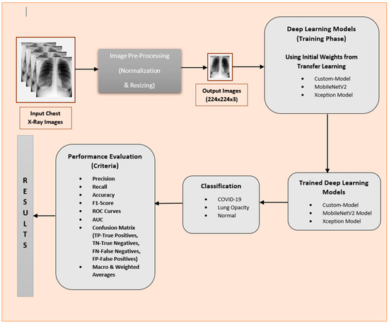 For the evaluation of the deep learning models on the subject dataset, the authors developed a custom deep learning model and used several reference state-of-the-art models employed in earlier COVID-19 chest X-ray studies. In addition to testing the known models, the authors first developed and tested a custom deep learning model. Among the state-of-the-art models, the chosen models were the MobileNetV2 model with additional layers on top, which gave the highest performance among other known models in previous research work, and the Xception model with some layers added on the top. The designated label for the custom deep learning model is Custom-Model. The overall system architecture is depicted in Figure 2.