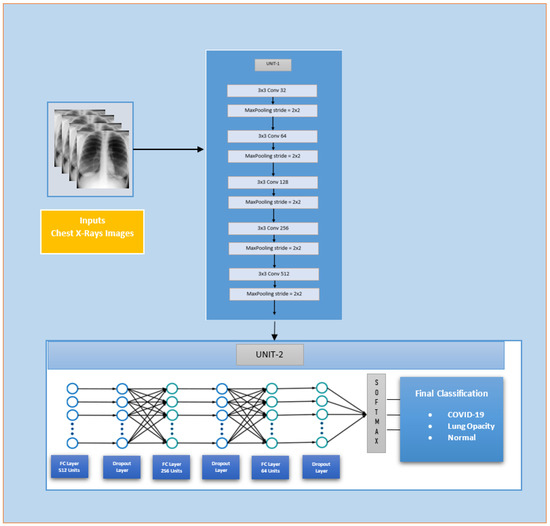 A custom CNN model, named Custom-Framed-CNN-Model, was developed where layers of convolution were stacked up following a pooling layer downsampling after each convolution layer, and increasing the number of filters of convolution layers, as shown in Unit-1 in Figure 4. The number of filters was increased to 512 in order to obtain more abstractions of high-level complex features in the COVID-19 chest X-ray images. Moreover, we maintained a low 3 × 3 filter size the stacked layers, as increasing the filter was shown to negatively affect the overall accuracy. After this, the feature maps were fed to a neural network containing 3 layers of neurons with dropout to avoid overfitting; finally, a classification layer was added as per Unit-2 Figure 4. The number of trainable parameters was 8,270,659.