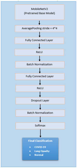 The subject model was utilized from the literature [43] and involved performance comparisons for different state-of-the-art models, with some added layers for COVID-19 diagnosis, as in Figure 5. The only difference is the addition of a linear transformation with dense layer before each ReLU block in the subject experimentation to further increase the complexity of the model.