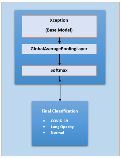 The Xception model [46] added few layers used for as evaluation of the dataset. The global average pooling layer (for minimizing overfitting by downsampling) followed by a Softmax layer were used for modification. The resulting architecture is shown in Figure 6. The number of trainable parameters was 20,813,099.