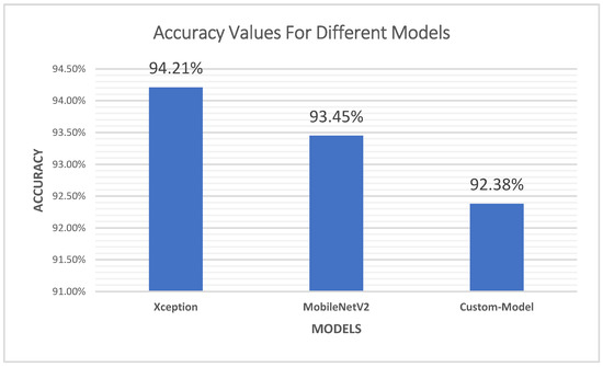 The hyperparameters used in the research work are shown in Table 1. For MobileNetV2, the hyperparameters were kept the same as in a previous reference study [23] that achieved the highest performance among several different state-of-the-art models; this was to maintain a reference when comparing to other models. Some of the hyperparameters for the other two models were altered [48]. The final learning rate for all layers of Xception was kept to 1.00 × 10−5. However, the number of epochs was reduced to 200 and 250 for the Custom-Model and Xception, respectively, with the learning rate 1.00 × 10. The latter models were found to converge within the specified epochs. A batch size of 32 was selected for the Custom-Model and Xception, as recommended in a previous study [49].