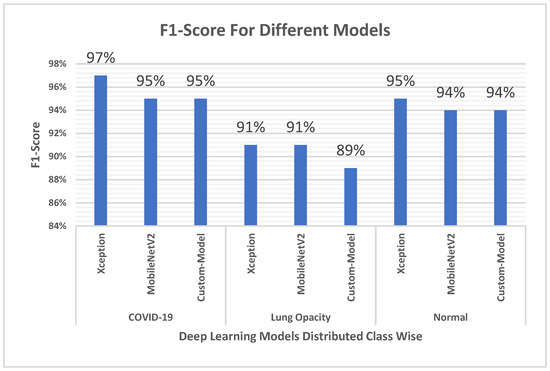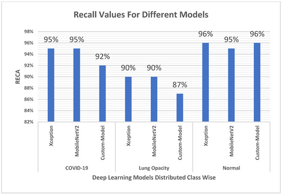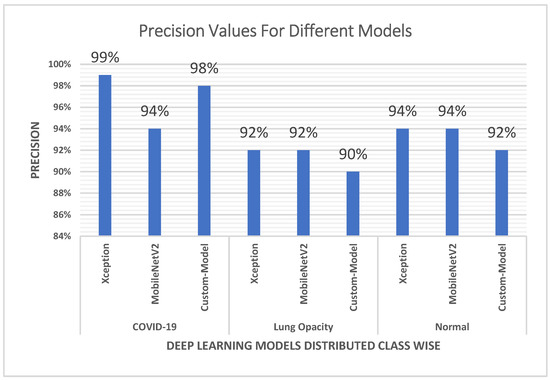 In terms of precision, the custom-developed Custom-Model performed better than the MobileNetV2 model by a difference of 4%, making it the best performer compared with various state-of-the-art models in a previous study [50]. The difference in precision values of the MobileNetV2 model and the Xception model is 5%. From the confusion matrix, it can be seen that MobileNetV2 wrongly predicted 60 non-COVID-19 cases to be positive, while this number was 12 for Xception, and 25 for Custom-Model. Precision gives more weighting to Custom-Model and Xception when compared with MobileNetV2 because if more people are wrongly identified as positive for COVID-19 and sent to treatment facilities (hospitals). Further, as reported by The New York Times in the USA, the COVID-19 pandemic led to the flooding of hospitals with patients causing a lack of available beds, and of doctors and nurses. Therefore, in such an alarming situation, it is critical for the diagnostic tests to be more accurate in diagnosing positive results for COVID-19.
