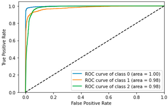 The ROC curves shown below are plotted for Class 0 (COVID-19), Class 1 (lung opacity) and Class 2 (normal). The ROC curve for custom-model is shown in the Figure 14.