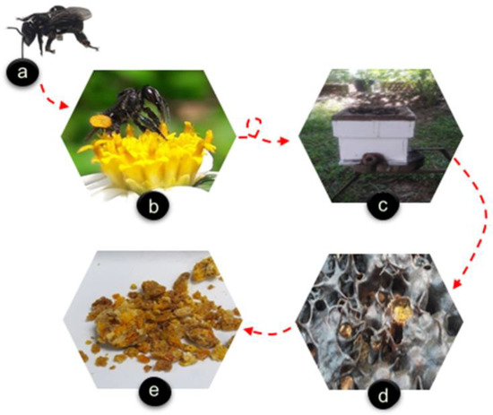Process of stingless bees collecting and producing bee pollen: (a) stingless bee, (b) bee collecting pollen, (c) stingless bee bringing pollen to hive, (d) pollen stored in cerumen pots, and (e) harvested bee pollen. Reprinted with permission from Ref. [108]. 2021, MDPI.