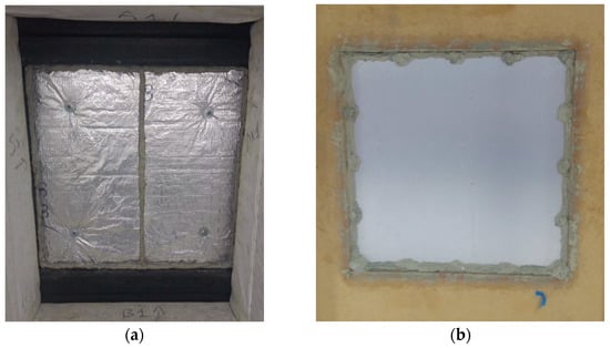 Experimental setup for STL measurement for benchmark solution: (a) hemi-anechoic chamber side view (mineral wool side); (b) reverberant room side view (honeycomb aluminum panel side).