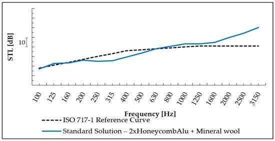 Figure 2 shows the prototype mounted in the acoustically coupled chambers to measure its STL according to ISO 15186 1–2 [,]. The panel, with dimensions of 800 × 800 mm, was installed on the test window between the reverberant and the hemi-anechoic chamber, with mastic used for sealing. The reverberant room had a volume of 252 m3 and was equipped with a tetrahedral source of the Genelec 8351A type and six B&K 1/4” type 4135 microphones. The sound power in the receiving room (hemi-anechoic chamber) was measured using a B&K sound intensity PP type 2681 probe. The weighted sound reduction index (Rw) was evaluated according to ISO 717-1 [], leading to the value of Rw (Figure 3) used as a benchmark. Since the results cannot be explicitly reported for confidentiality reasons, only the 10 dB increase is reported on the ordinate axis.