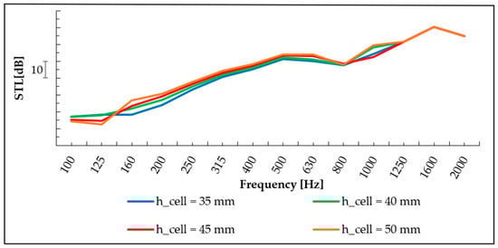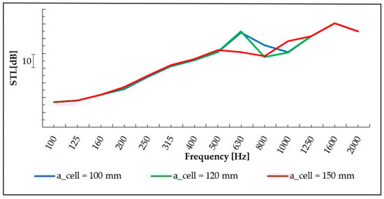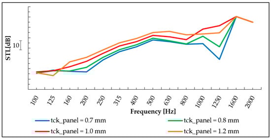 The results in terms of STL for each of the three groups of simulations are represented in Figure 5, Figure 6 and Figure 7, and the ΔRw values calculated with respect to the benchmark solution value for each configuration are reported in Table 2. Since the results cannot be explicitly reported for confidentiality reasons, only the 10 dB increase is reported on the ordinate axis, so that a comparison between the curves is still possible.