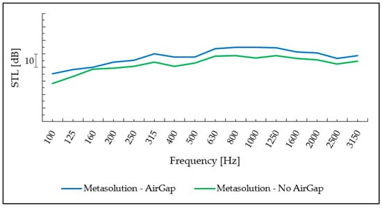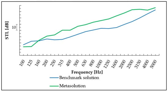 Figure 10 shows the comparison between the benchmark solution and the Metasolution experimental STLs. The Metasolution has a higher STL than the benchmark solution, except in the frequency range of 100–160 Hz. Moreover, the Metasolution achieves an ΔRw higher than 6 dB with respect to the benchmark solution.