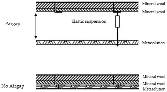 The optimized Metasolution was mounted and tested in a real-case scenario representative of applications on board ship, as a ceiling covering for acoustic insulation between decks. Two different configurations were chosen for testing, varying the distance of the sound insulation panel from the ceiling. The first configuration had an air gap between the panel and the ceiling, and the second one had no air gap (Figure 11).