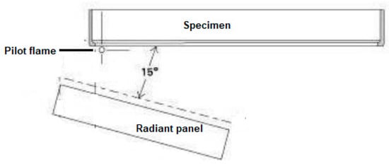 Two samples were tested, and the tests were performed in accordance with the guidelines reported in the FTP Code [,,]. The test method consists of exposing the specimen to a well-defined radiated heat flux generated by a gas-fired panel. A pilot flame is sited close to the hotter end of the specimen to ignite the volatile gases issuing from the surface (Figure 15).