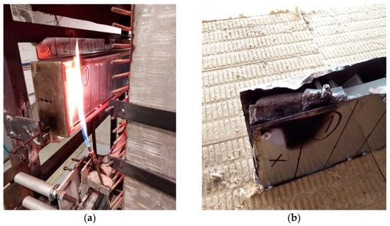 (a) Flame application on the second sample typology with the first layer in the metallic plate and (b) sample after the test.