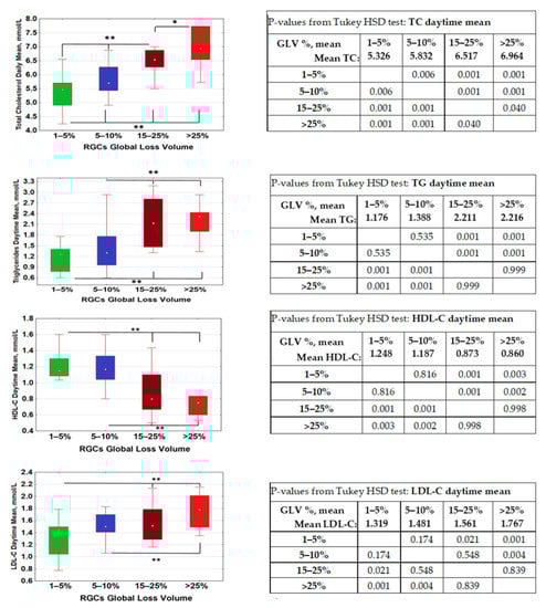 Daytime means of serum lipids in glaucoma patients with different degrees of retinal ganglion cell (RGC) loss, assessed as two-eye mean global loss volume (GLV%), gauged by high-definition optical coherence tomography. n = 114; RGC GLV < 5%, n = 16; GLV = 5–10%, n = 49, GLV = 15–25%, n = 35; n > 25%, n = 14). Effects for daytime means: total cholesterol, TC: KW-H (3;114) = 54.923; p < 0.0001; triglycerides, TG: KW-H (3;114) = 47.120; p < 0.0001; HDL-C: KW-H (3;114) = 34.988; p < 0.0001; LDL-C: KW-H (3;114) = 12.762; p = 0.005. GLV%: two-eye mean RGC global loss volume. p-values for statistically significant difference between groups after Tukey’s honestly significant difference (HSD) test post-hoc are shown in red. **: p < 0.01; * p < 0.05.