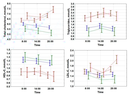 Blood samples were collected while patients were admitted at a daytime patient facility. Samples of venous blood were collected three times a day, at 08:00, 14:00, and 20:00. Total cholesterol (TC), high-density lipid cholesterol (HDL-C), and triglycerides (TG) were assessed photometrically by Cormay kit (Łomianki, Poland) on a semiautomatic analyzer (Cormay, Łomianki, Poland). Low-density lipid cholesterol (LDL-C) was estimated by Friedewald’s formula [76] as TG were below 4.5 mmol/L in all samples. As one patient failed to complete sample collection, data from 114 patients were included for analysis. Daytime mean (DM) corresponded to the individual average of the three consecutive serum lipid measurements (08:00–14:00–20:00). A standardized meal regimen was applied in this study: 20:30, a day before the study (recommendation): 100 g low-fat cottage cheese, 200 g oatmeal jelly); study day (served): 8:30: two eggs, unsweetened tea; 14:30: 100 g chicken breast, 100 g buckwheat porridge.