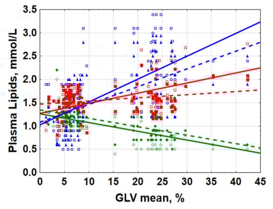 Since serum lipids also change as a function of age, we used age as a co-factor in the multiple regression assessing the effect of lipids on RGC GLV, Table 1. We found that GLV was more strongly associated than age with TG, HDL-C, or TC, both in the morning and in the evening. LDL-C surpassed age, however, only in the case of evening values and MEGs. Strong positive associations between MEGs and RGC GLV% were evident for all studied serum lipids (TG, b = 0.417 ± 0.089; TC, b = 0.720 ± 0.066; LDL-C, b = 0.557 ± 0.078), except for HDL-C (not significant). Of note, the relationship of TG DM with age (negative correlation, b = −0.320 ± 0.089) was opposite to that with GLV% (positive correlation, b = 0.417 ± 0.089), Table 1.