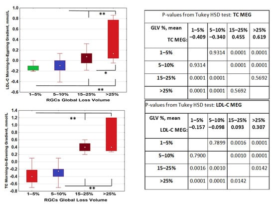 Morning–evening gradients (MEGs) of total cholesterol (TC, left) and low-density lipid cholesterol (LDL-C, right) depended on retinal ganglion cells global volume loss (GLV%). n = 114; RGC GLV < 5%, n = 16; GLV = 5–10%, n = 49, GLV = 15–25%, n = 35; n > 25%, n = 14). Note that MEG was decreasing in individuals with GLV% lower than 10% and changed sign to increasing in individuals with RGC GLV of 15% or more; LDL-C MEGs increased further in patients with GLV% above 25%. TC: KW-H (3;114) = 71.776; p < 0.0001; LDL-C: KW-H (3;114) = 41.933; p < 0.0001. GLV%: two-eye mean retinal ganglion cells’ global loss volume. p-values are in red for the differences between groups after adjustment for Tukey’s Honestly Significant Difference (HSD) post-hoc test. **: p < 0.01; * p < 0.05. □ Median;