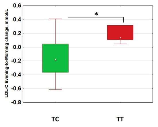 Evening rise in low-density lipid cholesterol, LDL-C was linked to CLOCK_3111 (rs1801260) TT genotype. Kruskal–Wallis, KW-H (1;18) = 5.500; p = 0.019. n = 18.; TC = 12; TT = 6 *: p < 0.05.