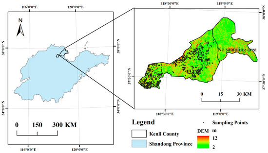 Kenli County in the Yellow River Delta region was selected as the study area (Figure 1). This county is located at the mouth of the Yellow River in the Yellow River Delta of northern Shandong Province in China, between 37°24′–38°10′ N and 118°15′–119°19′ E [22], with a total area of 2331 km2. It has a temperate monsoon climate, with high annual temperature and uneven spatial-temporal distribution of precipitation. The terrain is fan-shaped and slightly inclined from southwest to northeast [23]. The altitude ranges from 2 m to 11.61 m. The parent material is loess. The mechanical composition of the soil is mainly sandy loam. The main soil types in Kenli County are fluvo-aquic soil and coastal saline soil in the soil genetic classification of China. The corresponding soil group names from WRB are Cambisols and Solonchaks, respectively. The typical crops are cotton, rice and wheat-corn rotation. Kenli County has rich soil resources, and is one of the most abundant land reserve resources in the coastal areas of eastern China, with great potential for agricultural development.