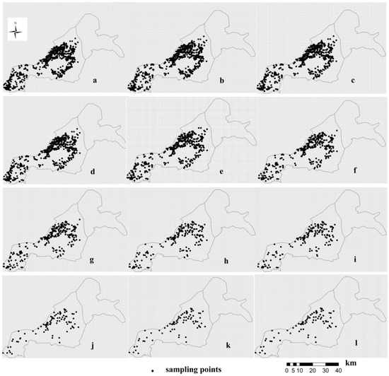 Based on the grid distribution point method, 1140 sampling points were used in this research. Some points on non-agricultural land were deleted and 1000 points were left. These sampling points were mainly distributed in cultivated land, and the interval between sample points was about 1000 m. In the actual sampling process, we adjusted the specific positions of these sampling points for road accessibility and crop planting. The topsoil from 0–20 cm was taken with a shovel, and then was put into a plastic bag and brought back to the laboratory for analysis. Although 926 samples were sampled, there were many uncertainties and complexity in field sampling. Consequently, we eliminated some points that were not standardized in the collection process, and removed some outliers. Finally, 908 samples were obtained, and 797, 700, 594, 499, 398, 299, 200, 149, 100, 75 and 50 sampling points were randomly selected from these 908 sampling points (Figure 2). The above real numbers represent the approximate number sets of 900, 800, 700, 600, 500, 400, 300, 200, 150, 100, 75, 50, respectively. Each sampling point was extracted from the last sampling point set to compare the characteristics of different sample sets. For example, the 700 sample set was extracted from the 797 sample set, and the 299 sample set was extracted from the 398 sample set. Combining all the sample data, a total of 12 sample sets were formed. The sampling process was conducted by the “Geostatistical Analyst” module of arcgis 10.0. The pH of each sample was measured in 1:2.5 mixtures of soil and deionized water with a pH meter by a potentiometric method [24].