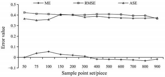 It can be seen from Figure 3 that ME of 75, 100, 150, 200 and 300 was greater than 0, and that of other sampling points was less than 0. The ME value varies with the number of sampling points, but the variation does not follow the law that the ME decreases with the increase of sample number. When the sampling points were 50 and 300, the ME values were close to 0. In theory, the closer the ME to 0, the higher the accuracy of spatial prediction. In this case, the value of ME is generally calculated from statistical methods. It is possible that the independent verification results of each sample point were poor, but the residual errors after addition and averaging were smaller. When ME is close to 0, the prediction has low accuracy. Therefore, the ME index cannot indicate the accuracy very well at this point. On the other hand, a single index cannot indicate the interpolation accuracy well, and multiple indexes may be more accurate to judge the interpolation accuracy. With the decreased of sample size, the distance of ME deviating from X axis first increased, then decreased and then slightly increased. It basically surrounded the X axis except for 75 and 100 sample points. Therefore, when the number of sample points was too small (75, 100), the ME of predicted values would become larger.