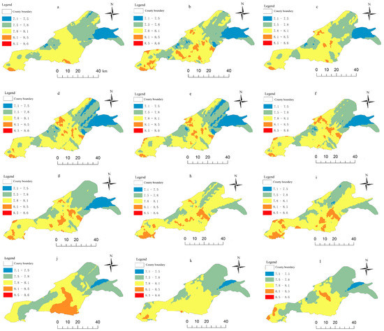 Distribution map of soil pH at different point sets. The letters (a–l) represent the spatial variation expression of soil pH at 908, 797, 700, 594, 499, 398, 299, 200, 149, 100, 75 and 50 sampling points.
