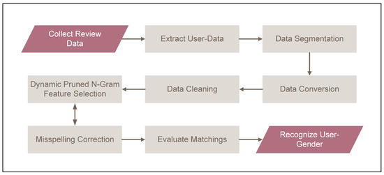 Generally, the proposed model incorporates several tasks starting from collecting data, followed by a series of analysis processes ending with assigning the proper labels to users, as shown in Figure 1. Collecting review data has been performed by scraping customers’ feedback available on the online markets (e.g., Amazon, BestBuy, Lenovo, Dell). The gathered data include the review text, date and time of writing the review, ratings, and information of the person who wrote this comment. Therefore, the next step is to extract the username field from the collected data. Commonly, websites do not allow spaces to be used when creating a username during the registration or submission of the review. Therefore, customers may find no alternative to writing concatenated names, making gender identification tasks more difficult. Therefore, word segmentation appears to be a suitable solution to handle this task.
