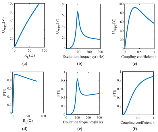 The relationship between output voltage, PTE and excitation frequency, equivalent load resistance, and coupling coefficient. (a) Output voltage changes with equivalent load resistance. (b) Output voltage changes with excitation frequency. (c) Output voltage changes with coupling coefficient. (d) PTE changes with equivalent load resistance. (e) PTE changes with excitation frequency. (f) PTE changes with coupling coefficient.