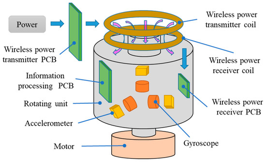 The MCRWPT system applied to power a single-axis RMINS is shown in Figure 4. The principle of the single-axis RMINS is that the motor drives the rotating unit to perform periodic rotation to suppress the error from inertial sensors. The IMU mounted on the rotating unit is the load for the receiver of the MCRWPT system. The IMU consists of three gyroscopes, three accelerometers, and an information processing PCB, where the gyroscopes and accelerometers are mounted orthogonally. The transmitter and receiver form the MCRWPT system. Both the transmitter and receiver include corresponding PCBs and coils. The DC power supply powers the transmitter of the wireless power.