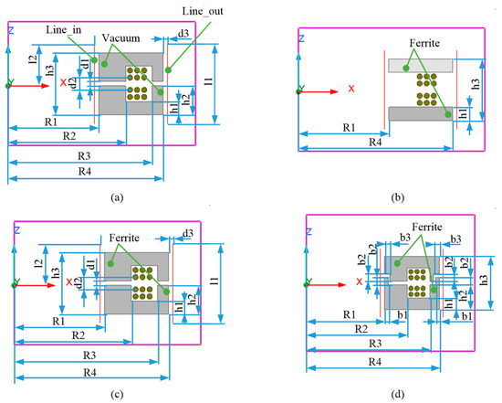 The geometry of the 2D simulation model. (a) Case1: without ferrite shielding. (b) Case2: with ring ferrite shielding. (c) Case3: with improved pot core ferrite shielding. (d) Case4: with special-shaped ferrite shielding.